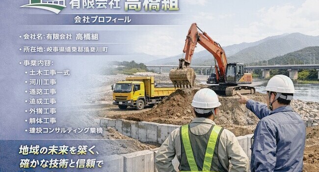 有限会社高橋組は、岐阜県揖斐川町を拠点に地域密着型の建設会社として、土木工事・河川工事・道路工事など幅広い建設事業を行っています。